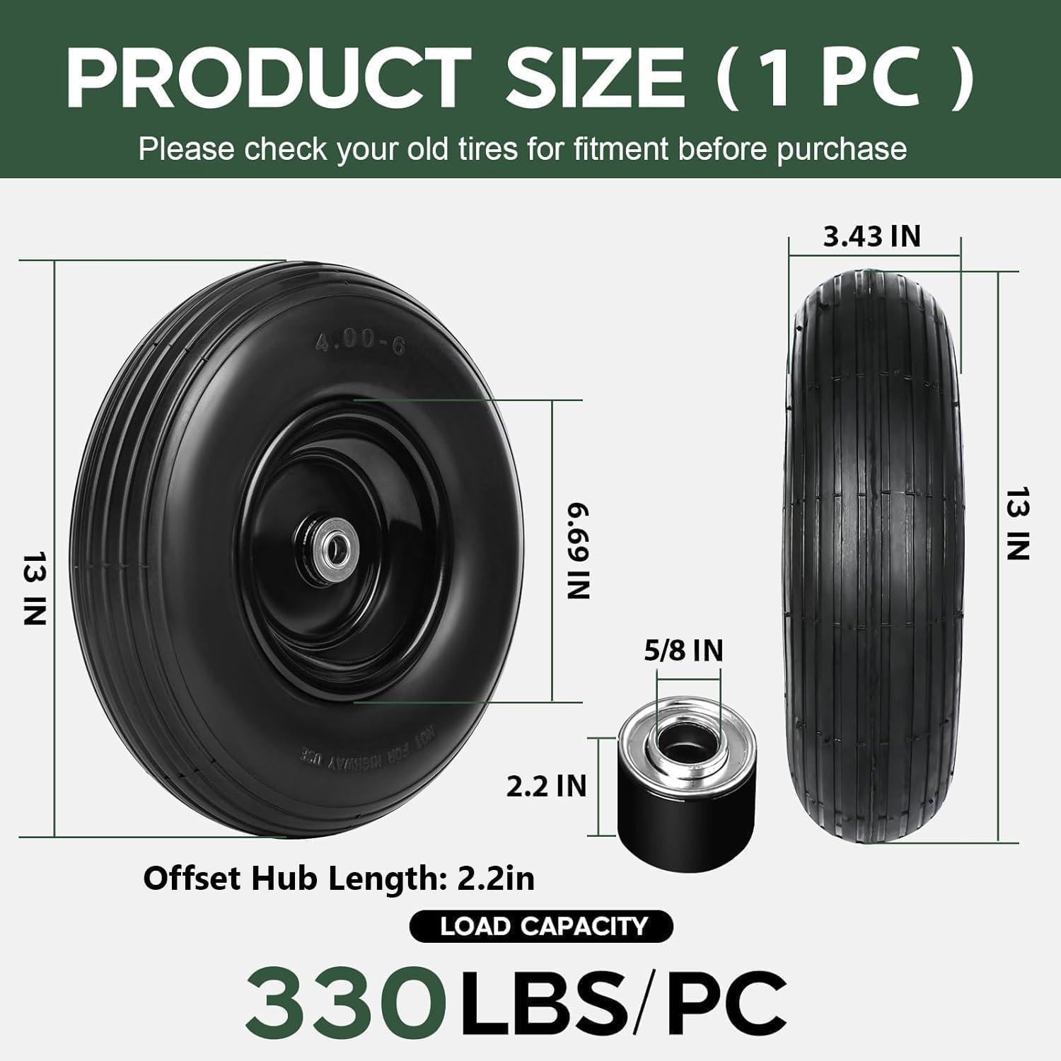 Skip flats forever with this 13 inch solid flat free handtruck wheel, 3 inch hub, smooth rolling, tough enough for daily hauling.
