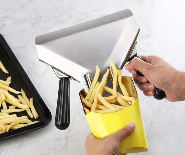 Speed up serving with this 9 x 8 stainless steel french fry scoop, dual handles, quick filling for fries and snacks.